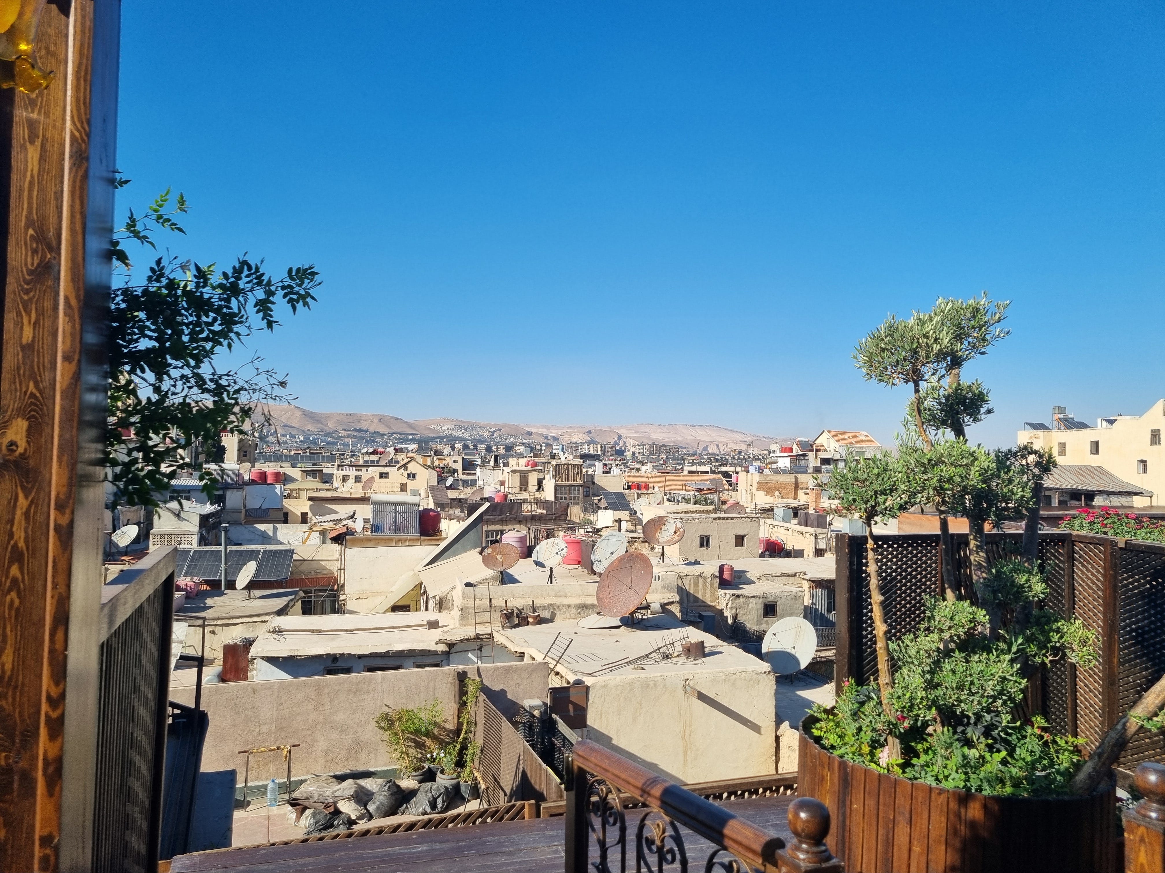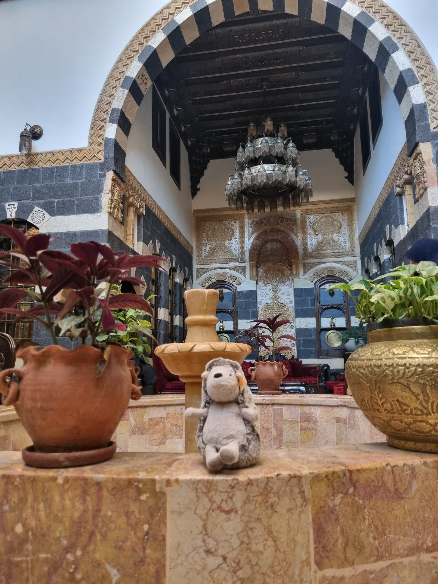 Maintenant on peut aller partout. Vraiment partout. Ahmad entre et me fait visiter les restaurants, les hôtels, les maisons, les boutiques. Un magnifique palace 5 étoiles de la vielle ville, superbement restauré avec 4 anciennes maisons damascènes reliées entre elles par des petites cours intérieures superbement ouvragées et leurs petites fontaines… Sur le toit on a restaurant et une terrasse couverte et ombragée d’où on peut admirer les toits de la vielles ville (et les panneaux solaires).