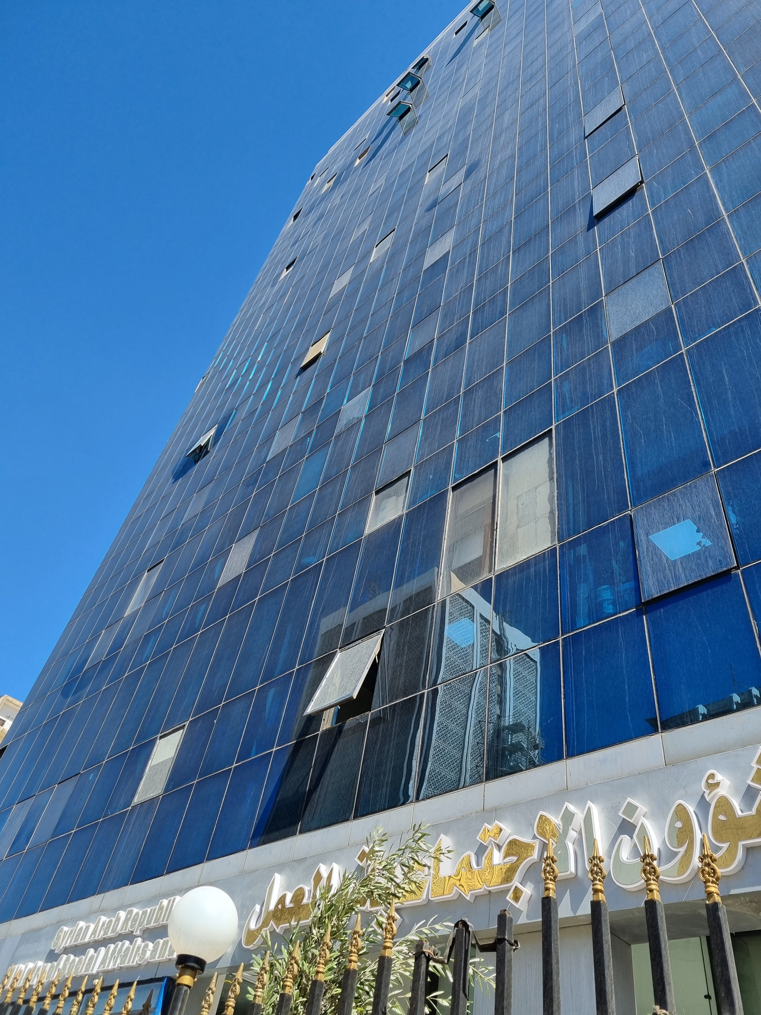 On passe dans les quartiers officiels. L’ambassade d’Iran, magnifique mais pas franchement en état de grâce, les anciens locaux de l’armée, éventrés tout récemment par les bombes israéliennes…