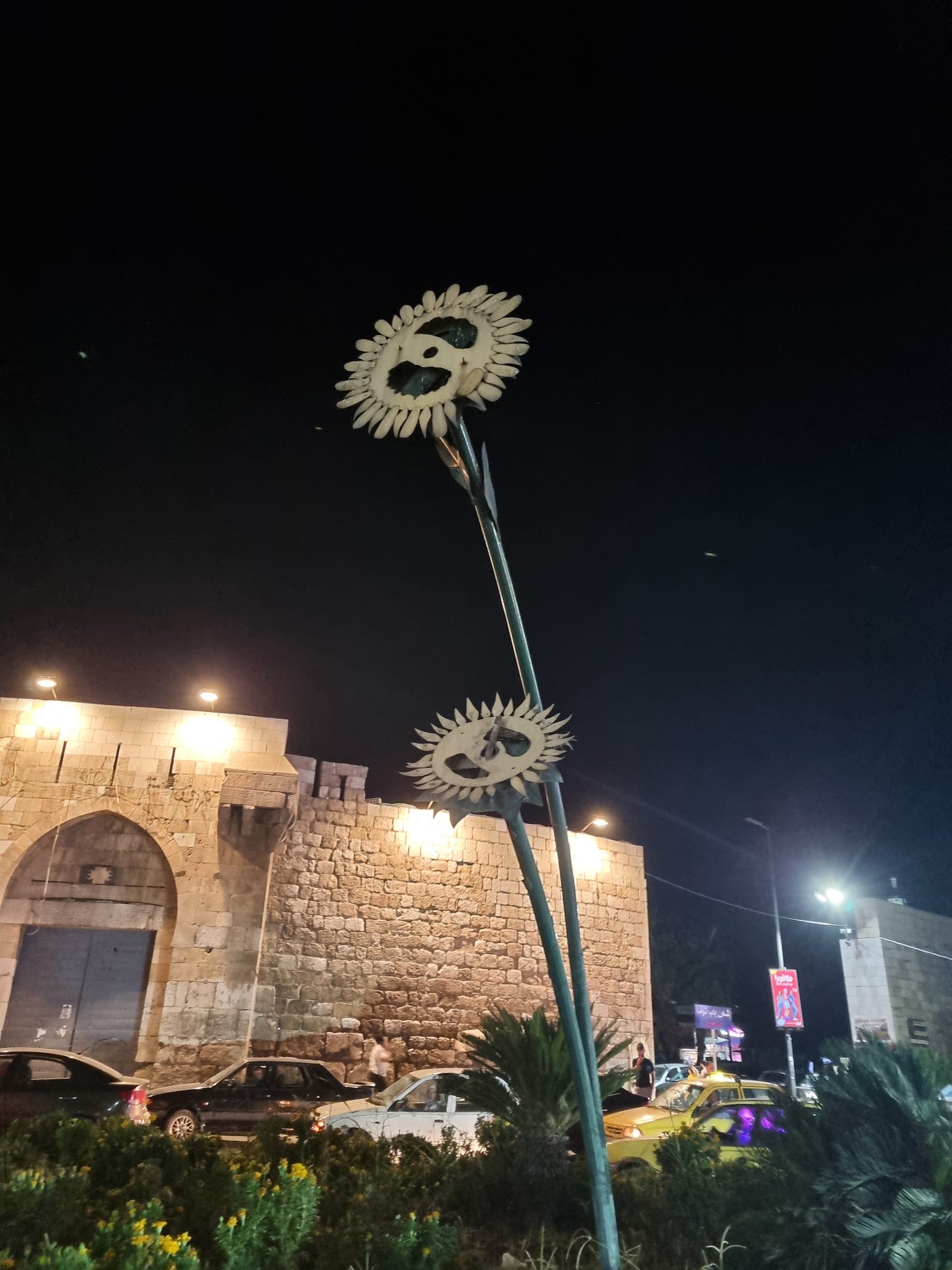 On passe devant la porte de Saint Thomas, Bab Touma. Devant les ruines de l’ancienne porte il y a un rond-point avec des tournesols en plastique, dont j’ai la très étrange impression qu’ils étaient déjà là il y a 15 ans. Ahmad me dit que c’est nouveau, et moi-même je doute que ces deux pauvres tournesols aient pu survivre une révolution et une guerre civile… Mais Damas, la vielle ville en tout cas, a l’air très similaire à ce qu’elle a toujours été, la liberté en plus, ce qui n’est pas rien. « Sous le régime on ne pouvait plus circuler le soir et la nuit. Trop de checkpoint et s’ils t’attrapaient ils t’envoyaient au service militaire ».