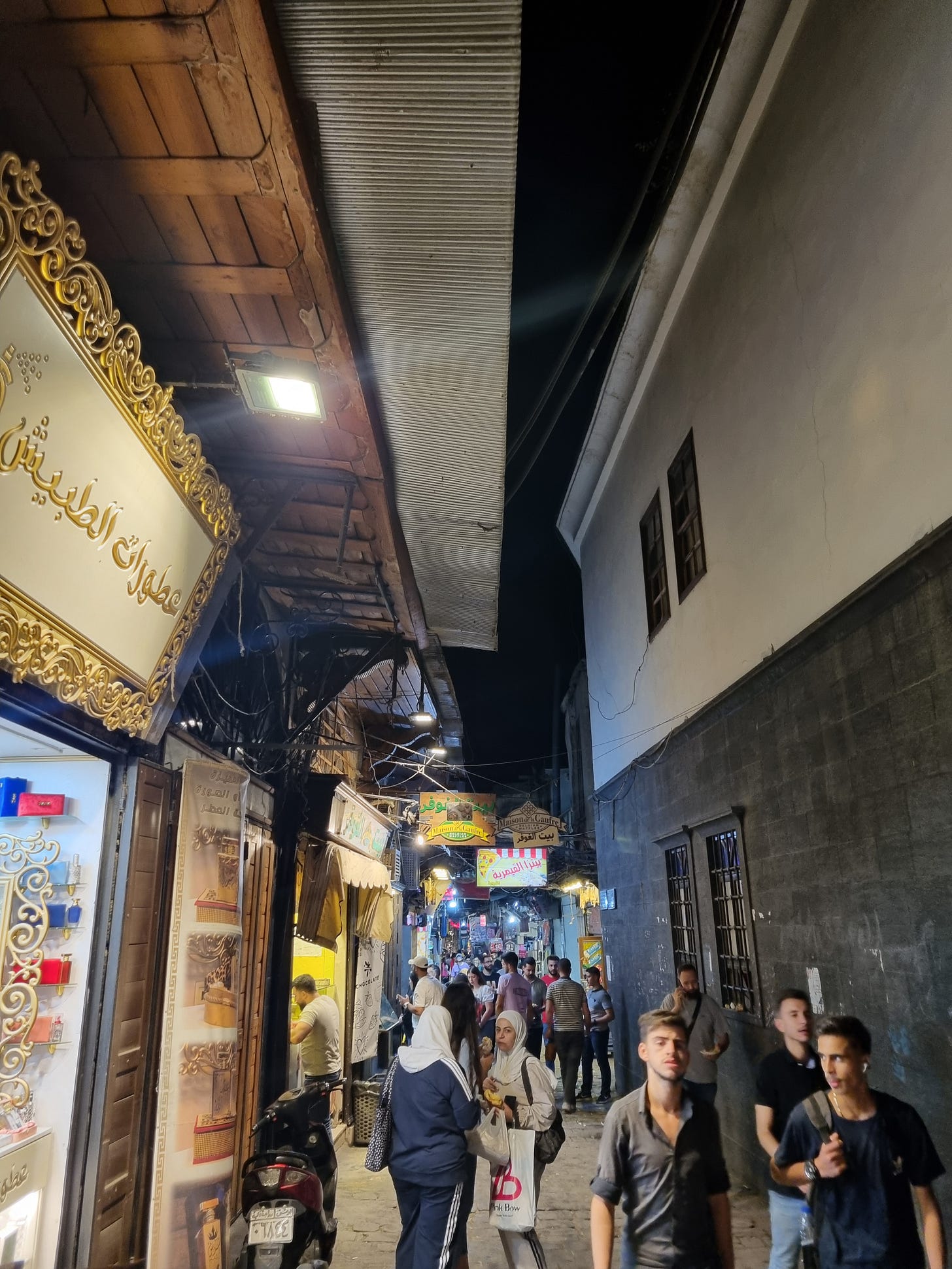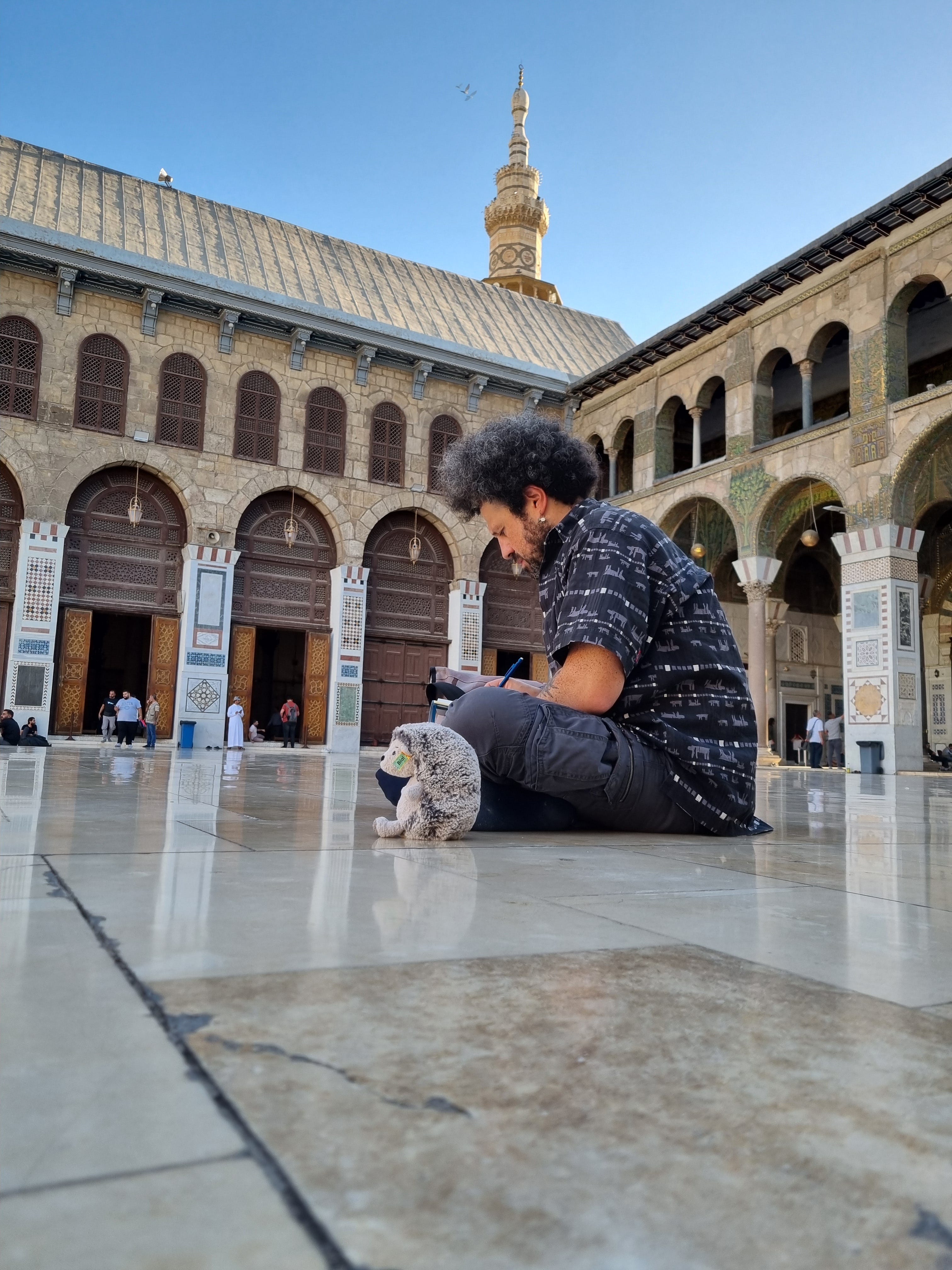 La cour de la grande mosquée des Omeyades de Damas est un des endroits les plus apaisants de la planète. Qui n’est jamais venu se déchausser ici ne connait pas la paix. Comme il y a dix ans, les enfants jouent toujours à lancer en l’air des petites hélices qui retombent et les jeunes sont toujours assis à chiller. On peut même maintenant charger son portable directement avec des USB au mur. Un couple se prend en photo avec un immense drapeau de la révolution. Activité compliquée par la séparation au cordon rouge et or entre les hommes et les femmes. Il faut se passer le téléphone au-dessus du cordon régulièrement.